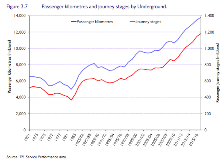 For the first time since 2008, the number of people using the world-famous London Underground – locally known as “the tube” – has fallen. After over two decades of long-term growth, passenger numbers are down 2%, from 1.38 billion in the financial year 2016-17, to 1.35 billion in 2017-18. Bus use also peaked in 2014, and has been falling steadily each year. Simply put, fewer people in London are using public transport – and this means fewer ticket sales. This has created a funding gap that puts plans for improvements and upgrades in serious jeopardy.